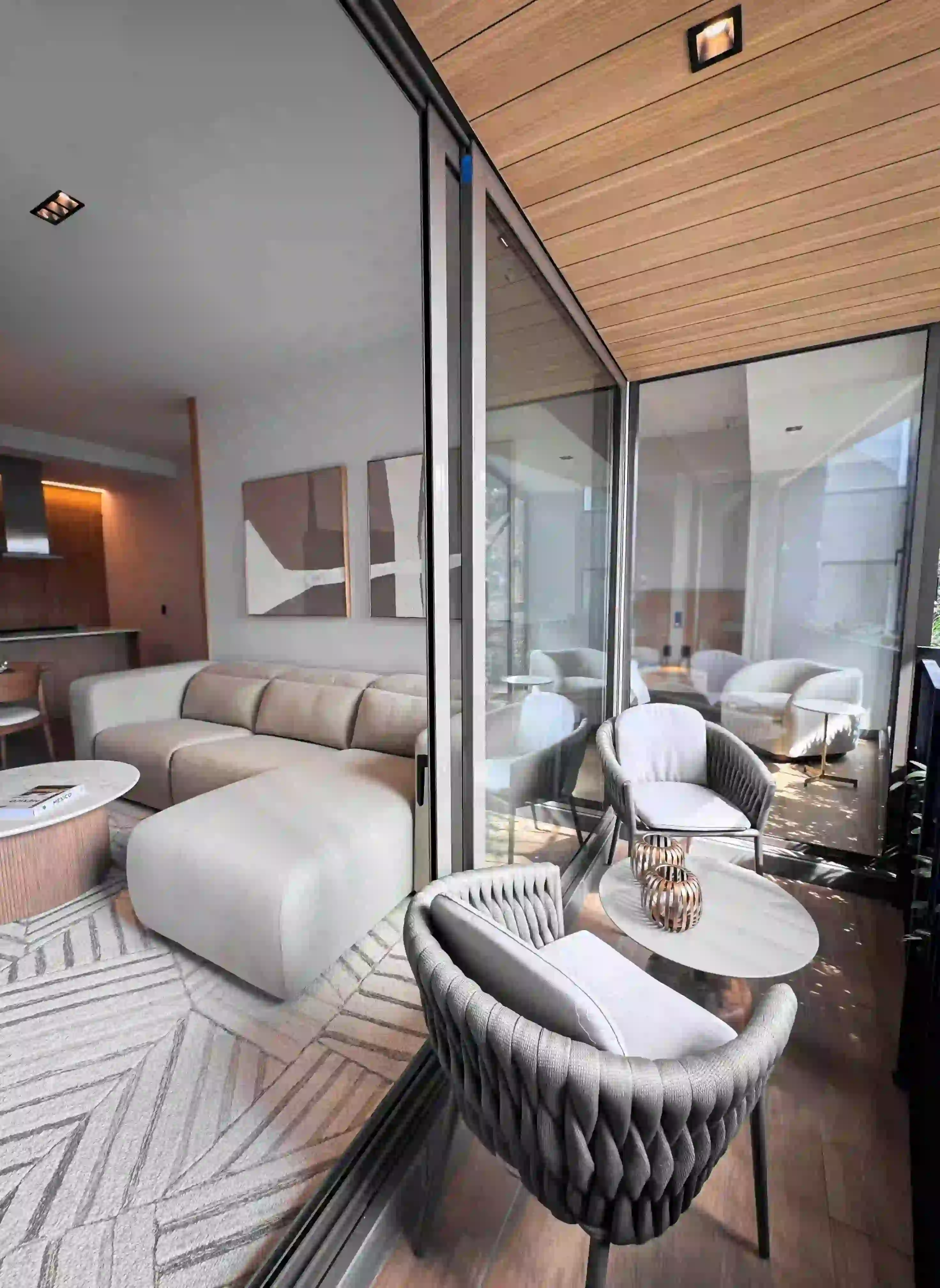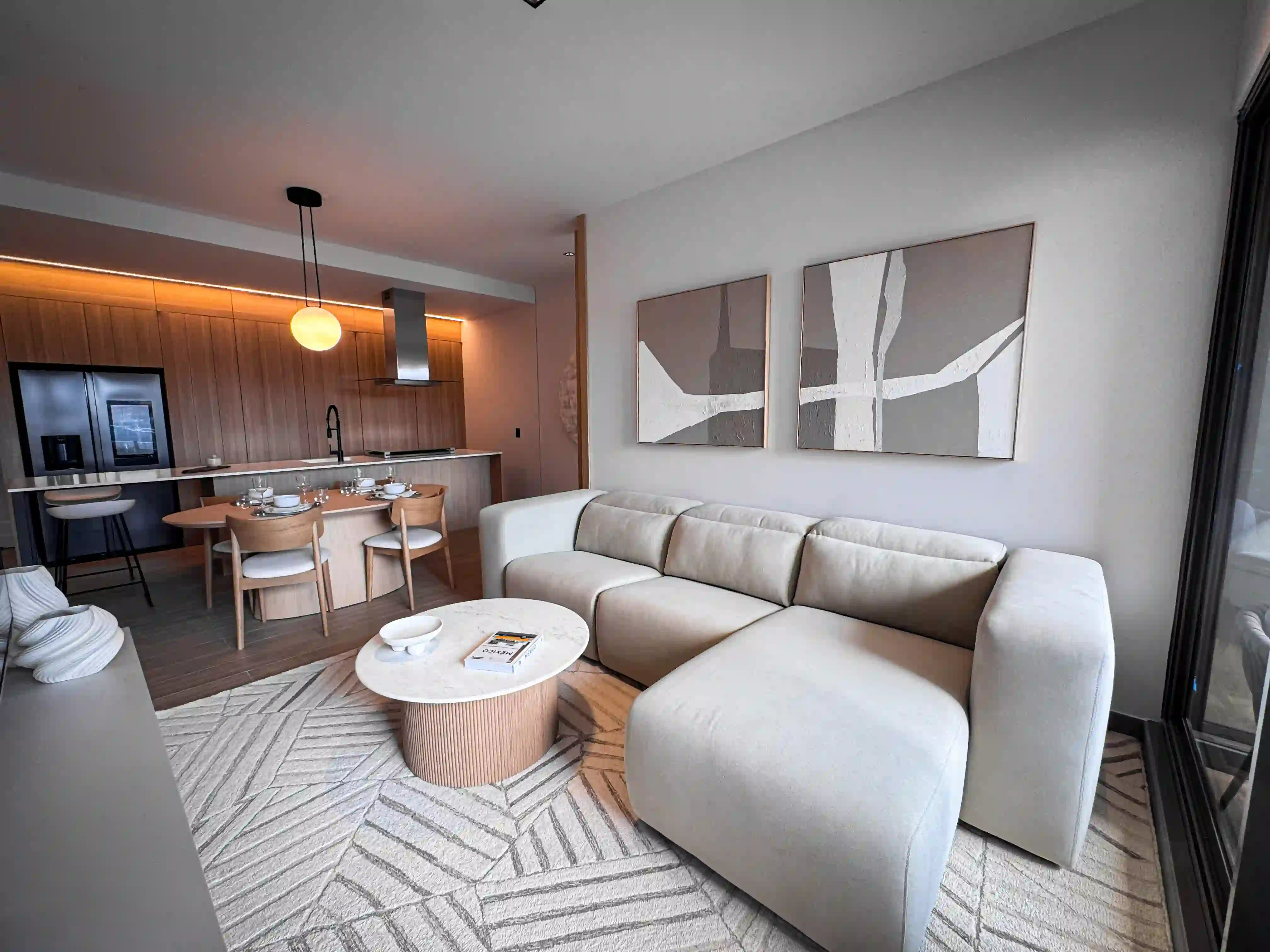 UN INTERIOR DISEÑADO PARA HABITARBe Grand del Valle es un departamento de muestra concebido como una experiencia integral de vivienda, donde el diseño interior se plantea desde la idea de habitar con calma, claridad y confort. El proyecto no busca únicamente mostrar un espacio terminado, sino comunicar una forma de vida basada en la funcionalidad cotidiana, la calidad espacial y la coherencia entre materiales, distribución y atmósfera.
