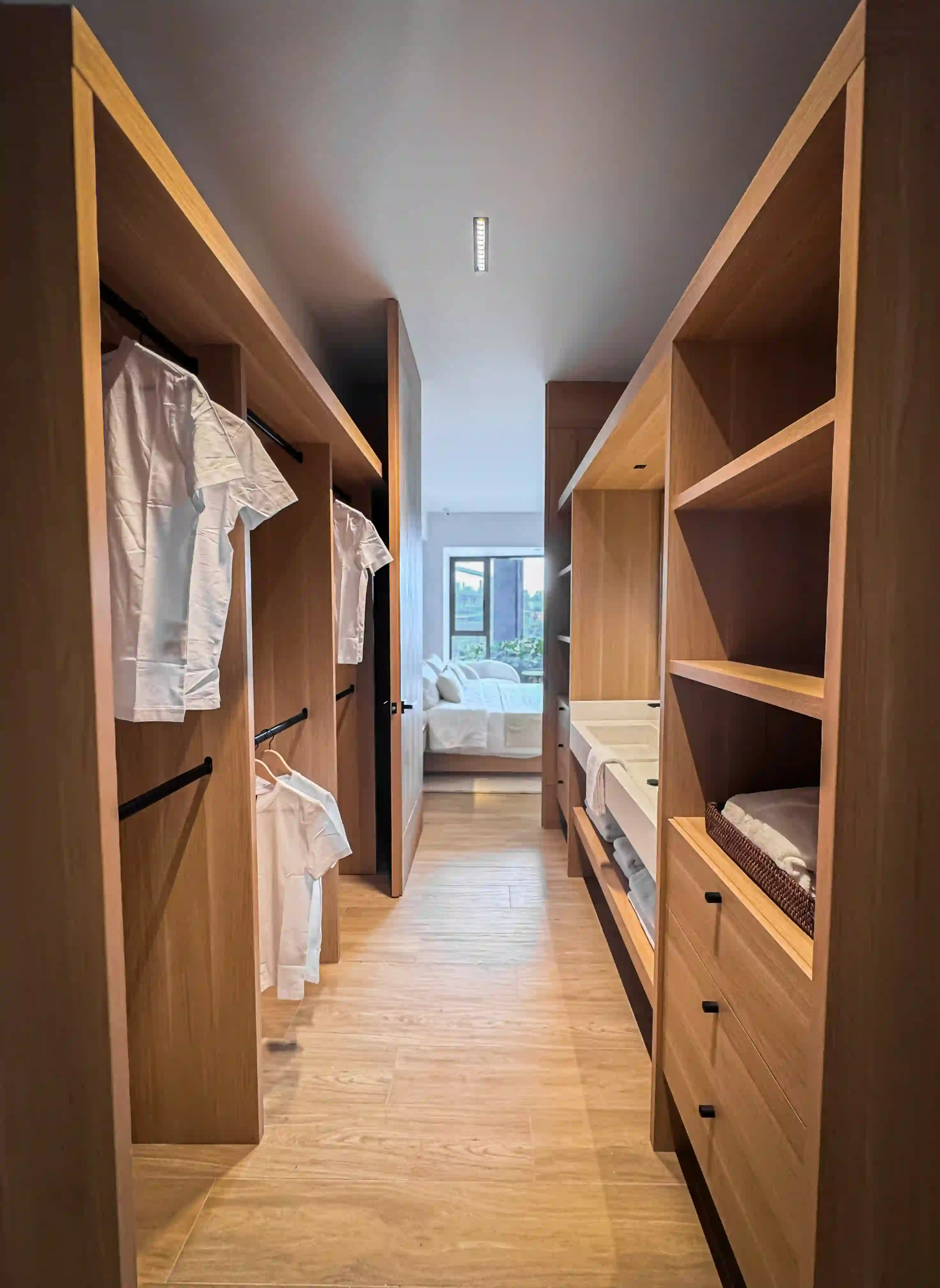FUNCIONALIDAD Y RELACIÓN CON EL EXTERIOREl vestidor de la habitación principal se resuelve mediante carpintería diseñada a medida, optimizando el uso del espacio y reforzando la sensación de orden y limpieza visual. Cada módulo responde a una lógica funcional clara, facilitando el almacenamiento y el uso cotidiano sin saturar el ambiente. La materialidad en madera clara aporta continuidad con el resto del departamento, integrando este espacio como una extensión natural del área privada.