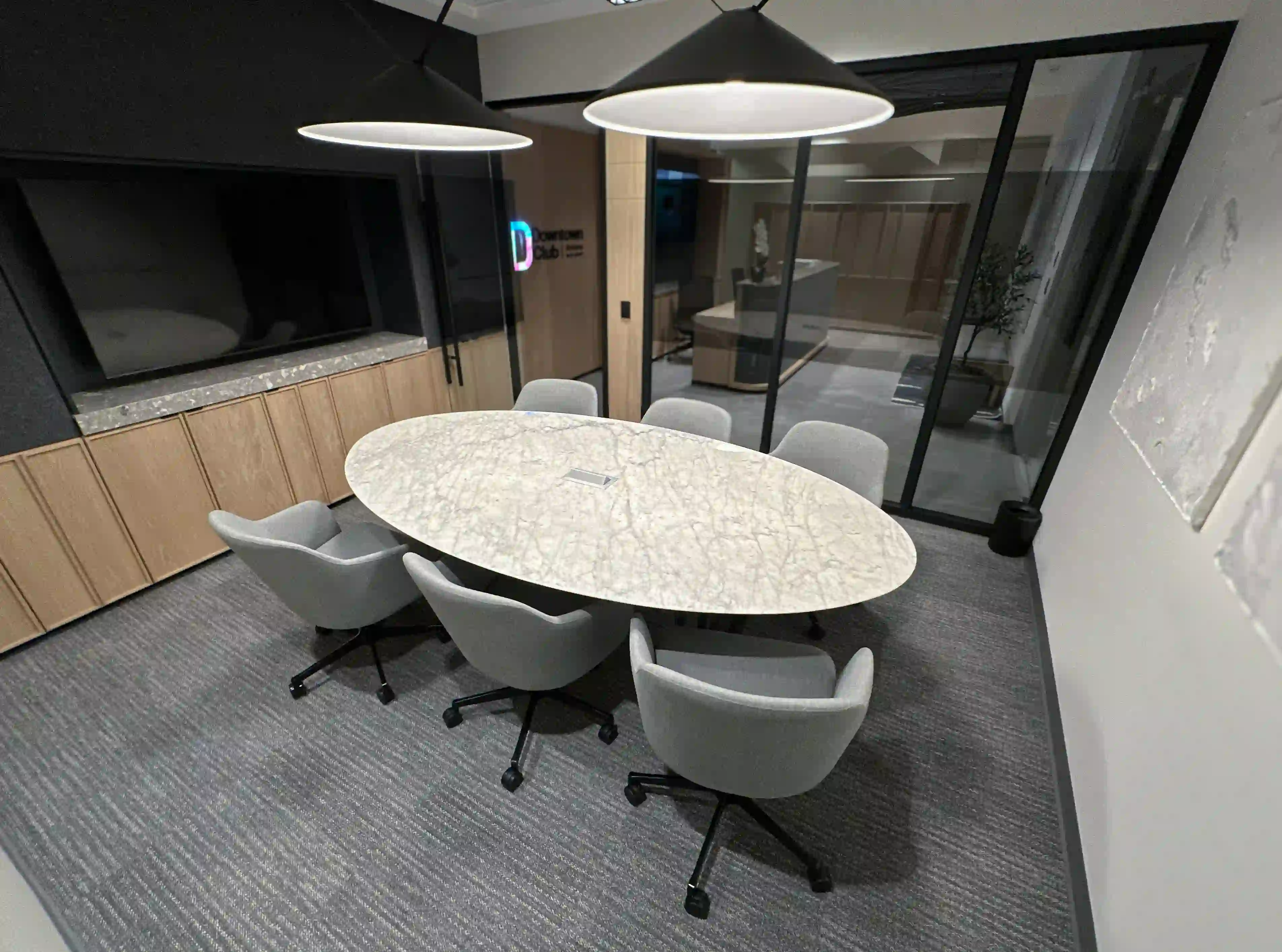 ESPACIOS DE COLABORACIÓN Y NETWORKINGLa funcionalidad de Downtown Club alcanza su máxima expresión en sus áreas dedicadas a la colaboración y el intercambio de ideas, diseñadas para responder a las dinámicas del trabajo híbrido actual. Las salas de juntas privadas, equipadas con mesas de mármol de diseño monolítico y tecnología audiovisual de punta, se presentan como escenarios ideales para la toma de decisiones estratégicas en un entorno de total privacidad. De forma complementaria, las zonas de lounge y el área de coworking ofrecen una atmósfera más relajada, con mobiliario ergonómico y sofás modulares de formas orgánicas que invitan al networking informal y a la creatividad colectiva. El área de coffee station, con sus acabados en piedra oscura y estanterías de madera, funciona como el corazón social del complejo, un punto de encuentro que eleva la experiencia diaria de los usuarios mediante un servicio de hospitalidad refinado. La transparencia garantizada por las divisiones acristaladas de piso a techo mantiene una conexión visual constante con el resto del "Hub", promoviendo una sensación de amplitud y comunidad. En conjunto, estas áreas forman un ecosistema flexible y vibrante que impulsa el crecimiento empresarial en un entorno de lujo, confort y eficiencia absoluta.