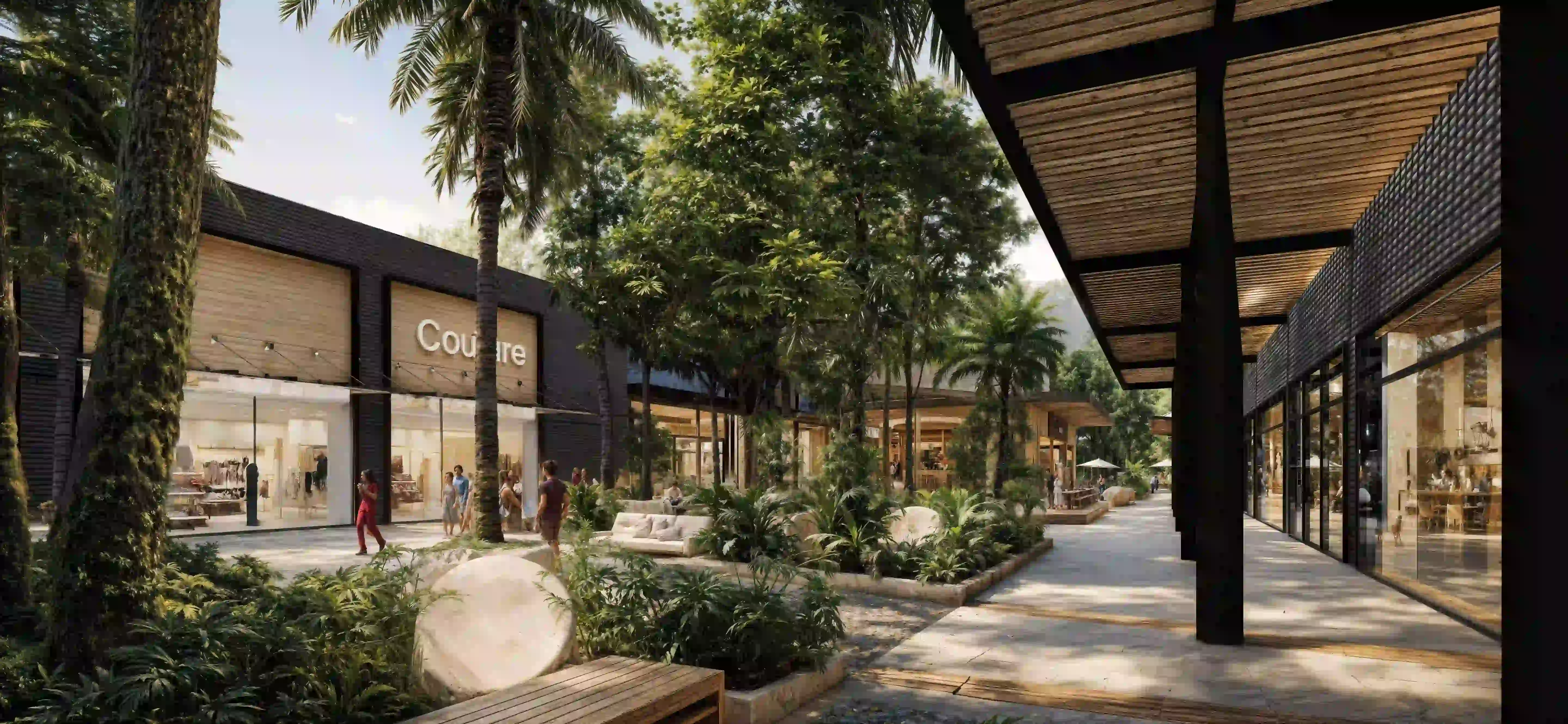 La arquitectura comercial se apoya en fachadas permeables, pórticos y áreas de transición que permiten una relación fluida entre interior y exterior. Estos espacios se complementan con zonas ajardinadas, áreas de descanso y plazas que invitan a permanecer más allá del consumo inmediato. El resultado es un entorno comercial que funciona como espacio urbano activo, capaz de integrarse de manera natural al resto del master plan y de generar identidad propia dentro del conjunto.