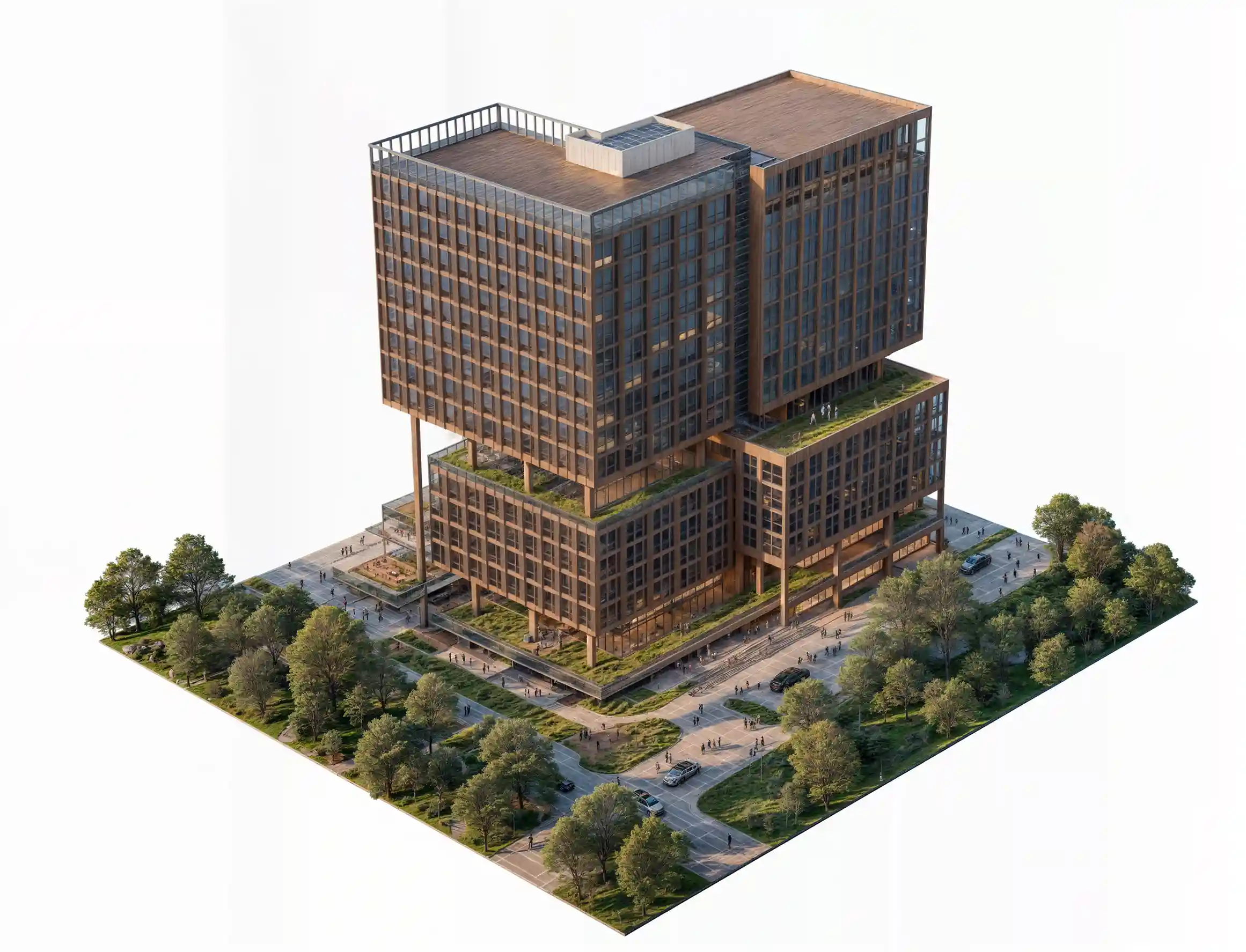 La volumetría se organiza a partir de cuerpos superpuestos que fragmentan la escala del edificio y permiten una lectura más amable de su altura. Esta configuración escalonada introduce terrazas y vacíos intermedios que funcionan como espacios de transición, aportando áreas verdes elevadas y puntos de encuentro que enriquecen la experiencia urbana. De esta manera, el proyecto propone una verticalidad activa, que no se aísla del contexto, sino que dialoga con él a distintas alturas.