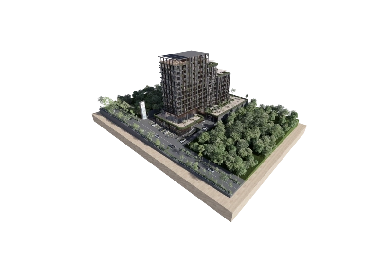 - El proyecto se despliega con ingenio en un terreno rectangular, aprovechando al máximo cada metro cuadrado. La entrada principal alberga una zona comercial dinámica, proporcionando un acceso animado y funcional. La torre residencial, ubicada estratégicamente en el fondo, se eleva majestuosamente y se convierte en el epicentro de la experiencia de vida.