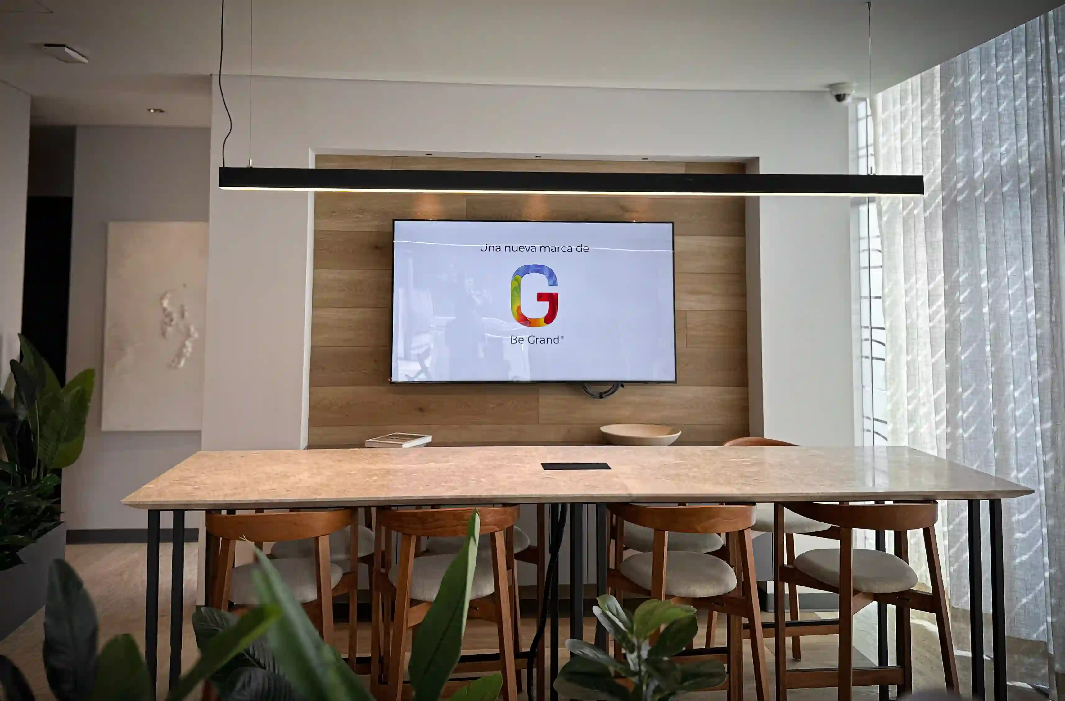 TRANSPARENCIA Y BIENESTAR BIOFÍLICOEl detalle técnico y la atención a la experiencia sensorial culminan en una estrategia de iluminación y paisajismo interior que eleva el bienestar del usuario. El proyecto utiliza luminarias lineales LED integradas y acentos puntuales que resaltan las texturas de la madera y la piedra, creando una atmósfera dinámica que cambia sutilmente a lo largo del día. Complementando esta iluminación, se ha implementado una estrategia biofílica mediante la integración de vegetación natural en puntos estratégicos, lo cual aporta frescura visual y mejora la calidad del aire en el entorno corporativo.