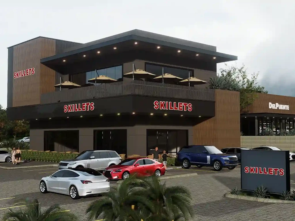 Espacios como las terrazas exteriores de Skillets demuestran una vocación por el confort y el ocio, permitiendo que el visitante disfrute del clima local en un entorno seguro y estéticamente cuidado. El uso de texturas premium en el espacio público, junto con una iluminación nocturna diseñada para resaltar la volumetría de los edificios y la silueta de la vegetación, transforma este destino en un lugar atractivo a cualquier hora del día. Pads Guatemala demuestra que la eficiencia operativa del comercio rápido puede coexistir perfectamente con un diseño que prioriza el bienestar humano y la conexión con la naturaleza, redefiniendo la experiencia de consumo en la ciudad.