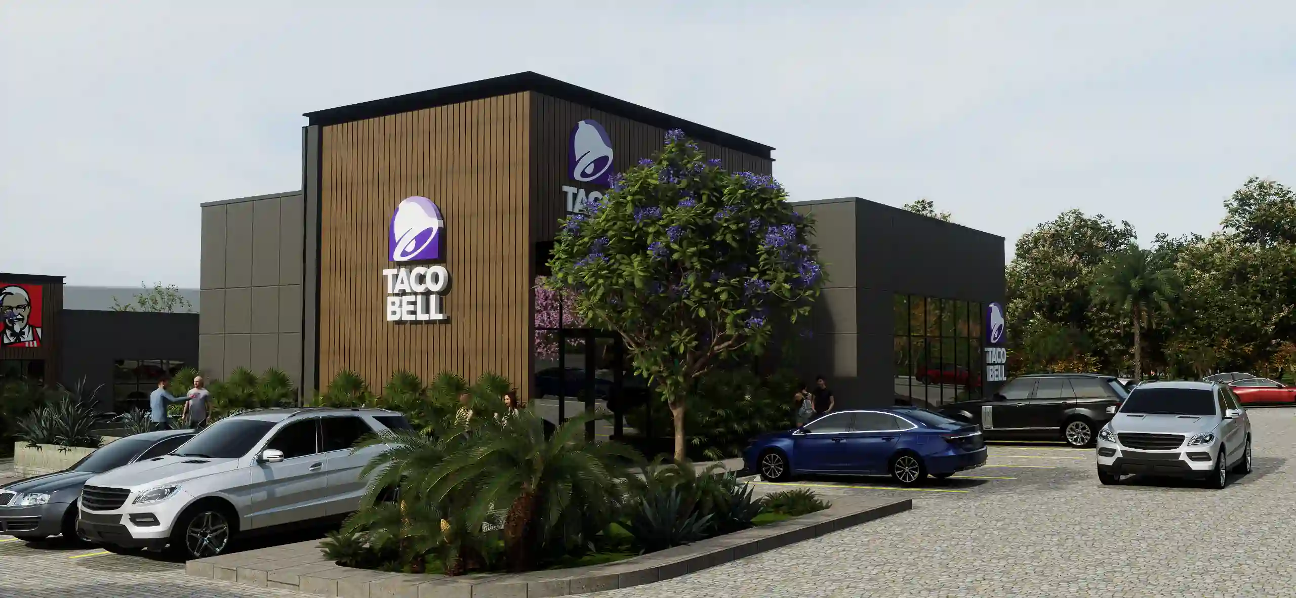 El planteamiento urbanístico no solo se enfoca en la funcionalidad del automóvil, sino que busca una armonía visual con el paisaje natural circundante, utilizando pavimentos de adoquín arquitectónico y un diseño de paisaje que suaviza la escala de las construcciones. La disposición de cada pad permite una visibilidad óptima desde la arteria principal, mientras que la conservación de la vegetación densa al fondo del predio actúa como un remate escénico que aporta frescura y una atmósfera de bienestar inusual en los complejos de servicios rápidos convencionales, transformando un sitio de paso en un destino urbano de alta calidad.