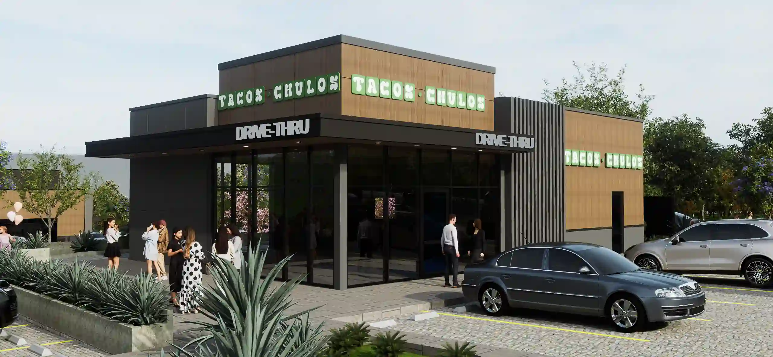 IDENTIDAD Y LENGUAJE ARQUITECTÓNICOEl desafío arquitectónico de Pads Guatemala consistió en crear una envolvente estética coherente que pudiera albergar diversas identidades corporativas de marcas globales, como Little Caesars y Taco Bell, sin comprometer su visibilidad ni su manual de marca. Se optó por un estilo industrial-contemporáneo que utiliza una paleta de materiales honestos y sofisticados para unificar el conjunto. Las fachadas están compuestas por paneles arquitectónicos en tonos gris oxford y grafito, los cuales proporcionan una base sobria y elegante para los acentos cromáticos de cada comercio.