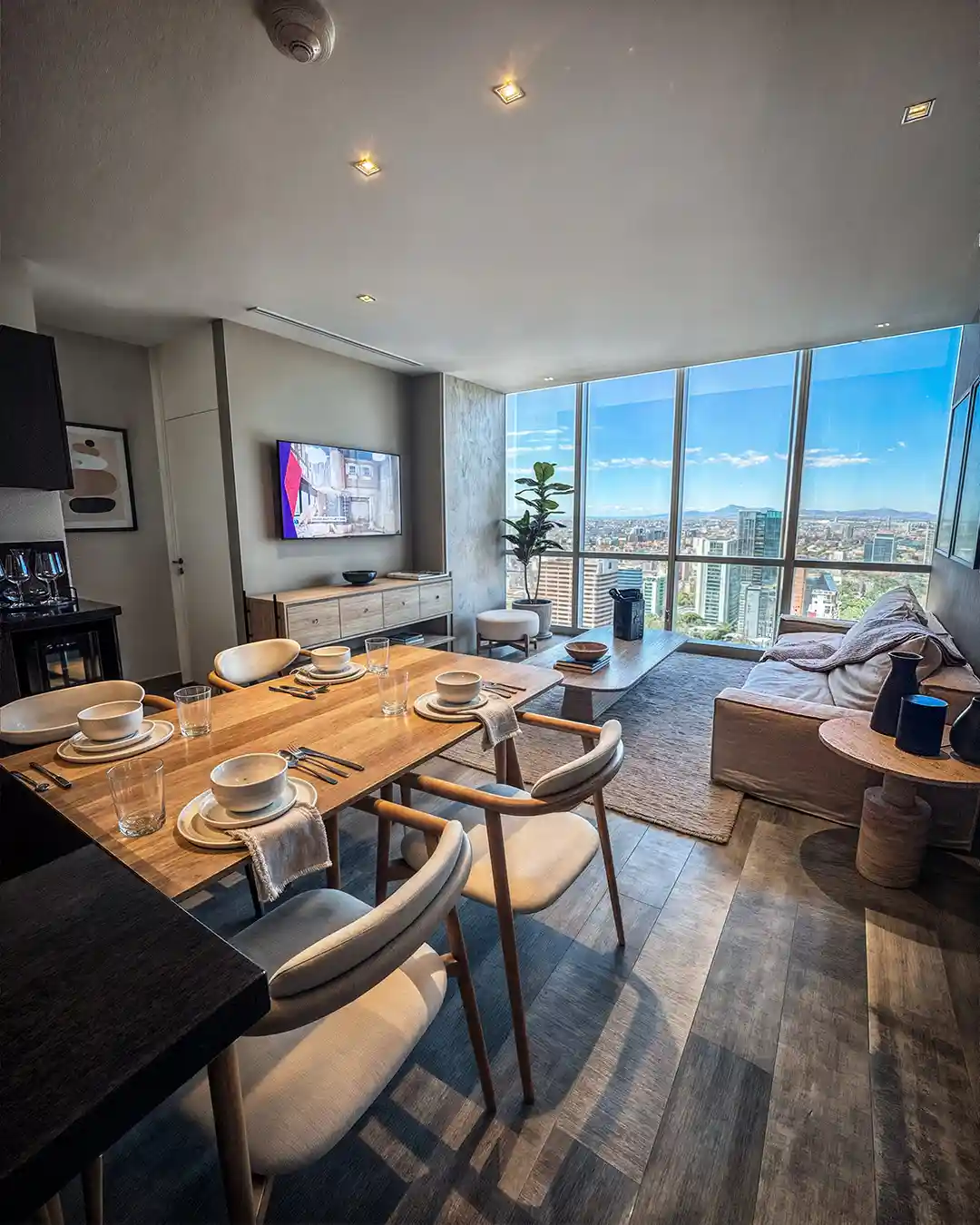 EL REFUGIO PRIVADOLas unidades residenciales de Vitant Riga Country, ubicadas del nivel 22 al 33, son el epítome del confort y el diseño vertical contemporáneo. El departamento muestra exhibe una coherencia visual absoluta con las áreas comunes, utilizando una paleta de materiales nobles que garantizan bienestar y durabilidad. Las estancias principales están envueltas en maderas claras y acabados pétreos que contrastan con textiles suaves en tonos arena y terracota. Los grandes ventanales de piso a techo inundan los interiores de luz natural, convirtiendo el paisaje urbano en parte integral de la decoración.
