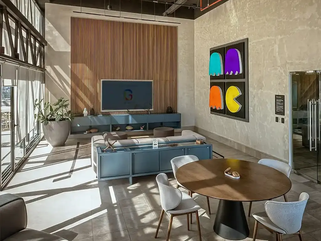 El mobiliario ergonómico y las bancas curvas promueven la fluidez social, invitando a los residentes a disfrutar de momentos de ocio en un entorno de alta exclusividad. Se han incorporado acentos de iluminación neón y piezas de arte gráfico que inyectan energía al ambiente, contrastando con la calidez de los muros revestidos en madera. Esta zona ha sido concebida para fomentar el sentido de comunidad entre los usuarios, proporcionando una infraestructura de clase mundial para el descanso y la socialización informal sin necesidad de salir del edificio.