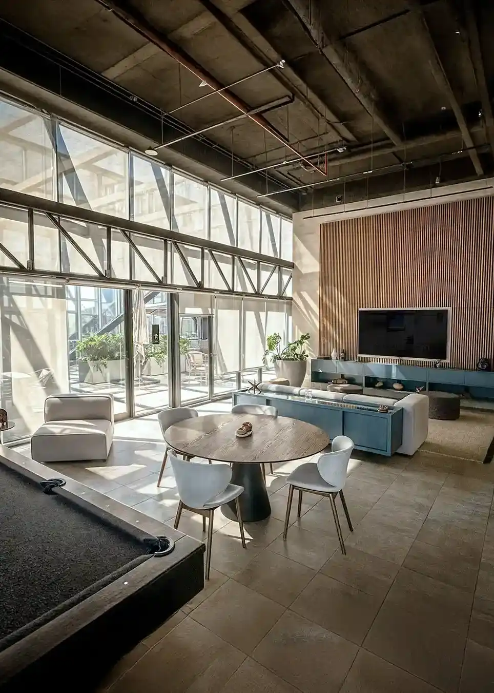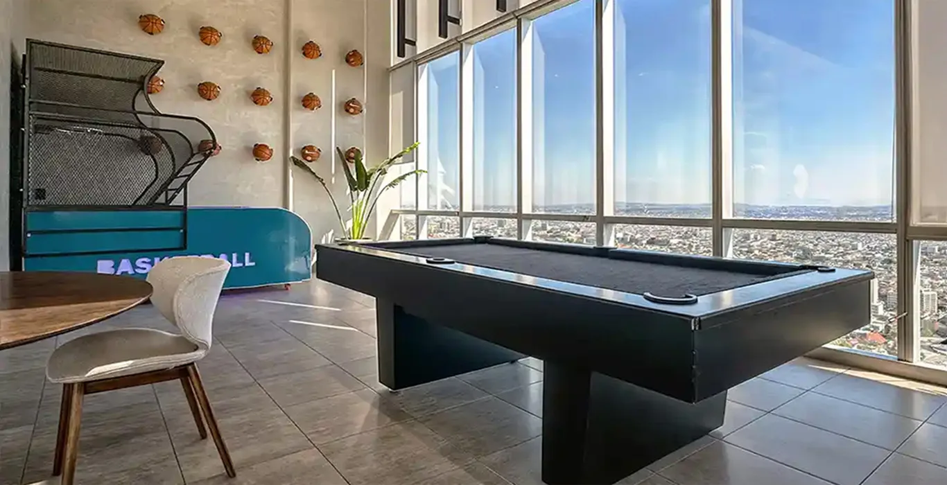 OCIO, SPORTS BAR Y ENTRETENIMIENTOEl entretenimiento en Vitant Riga Country alcanza un nuevo estándar en sus áreas de recreación del nivel 22. El Sports Bar y la zona de juegos han sido diseñados con un carácter dinámico y sofisticado, utilizando techos técnicos expuestos que aportan un aire industrial-contemporáneo. Este espacio destaca por su versatilidad, albergando mesas de billar, áreas de televisión de gran formato y una barra de diseño monolítico acabada en piedra y madera.