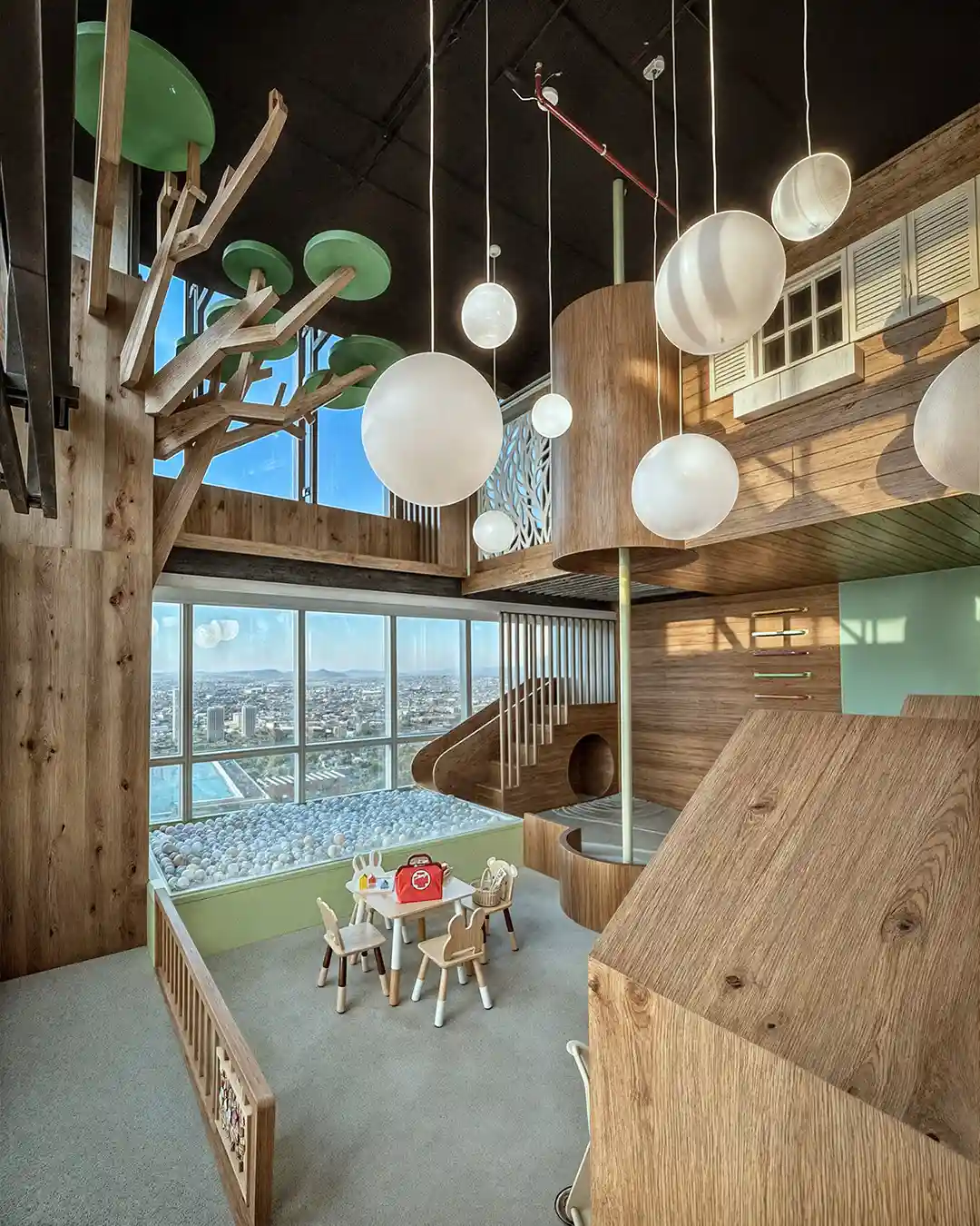 IMAGINACIÓN Y JUEGOEl Kids Club en el nivel 33 es un espacio diseñado para desatar la imaginación de los más pequeños en un entorno seguro y estéticamente impecable. El diseño se aleja de los colores primarios estridentes para abrazar una paleta de tonos pastel y maderas claras que mantienen la coherencia con el resto del edificio. Elementos protagónicos como estructuras de madera que evocan casas de árbol, piscinas de pelotas y muros con murales de nubes y arcoíris crean un universo lúdico único.